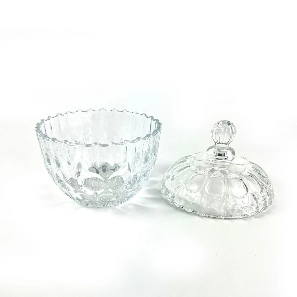 Bombonera de vidrio con tapa, ideal para colocar dulces y adornar. Con medidas, Largo: 14.2 cm, Ancho: 14.6 cm y Alto: 12 cm