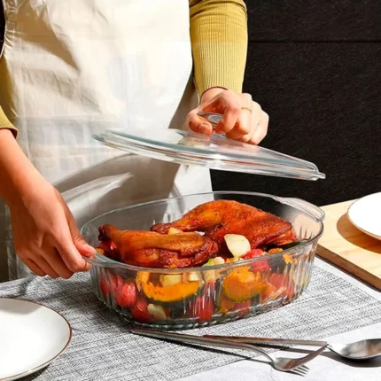 Cacerola ovalada de 1.8L elaborada en vidrio borosilicato, ideal para hornear, cocinar y servir con estilo. Resistente a altas temperaturas y cambios térmicos.