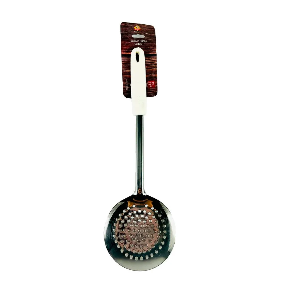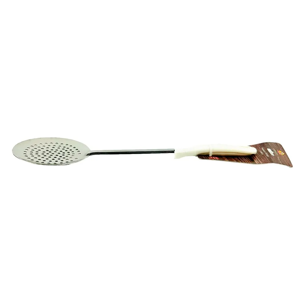 Espumadera de acero inoxidable con mango de plástico ergonómico para un mejor agarre. Super resistente y fácil de lavar. Ideal para sacar los alimentos fritos o cocidos del interior de la sartén o cacerola, también lo puedes emplear para quitar la espuma a los caldos o líquidos. No retiene olores ni sabores, cuenta con un orificio en el mango para colgarlo con facilidad.