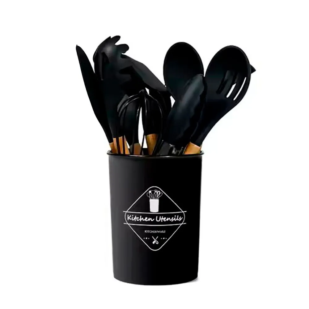 Jgo Utensilios Negro de Silicona para Cocina 12 Pz Mango Madera