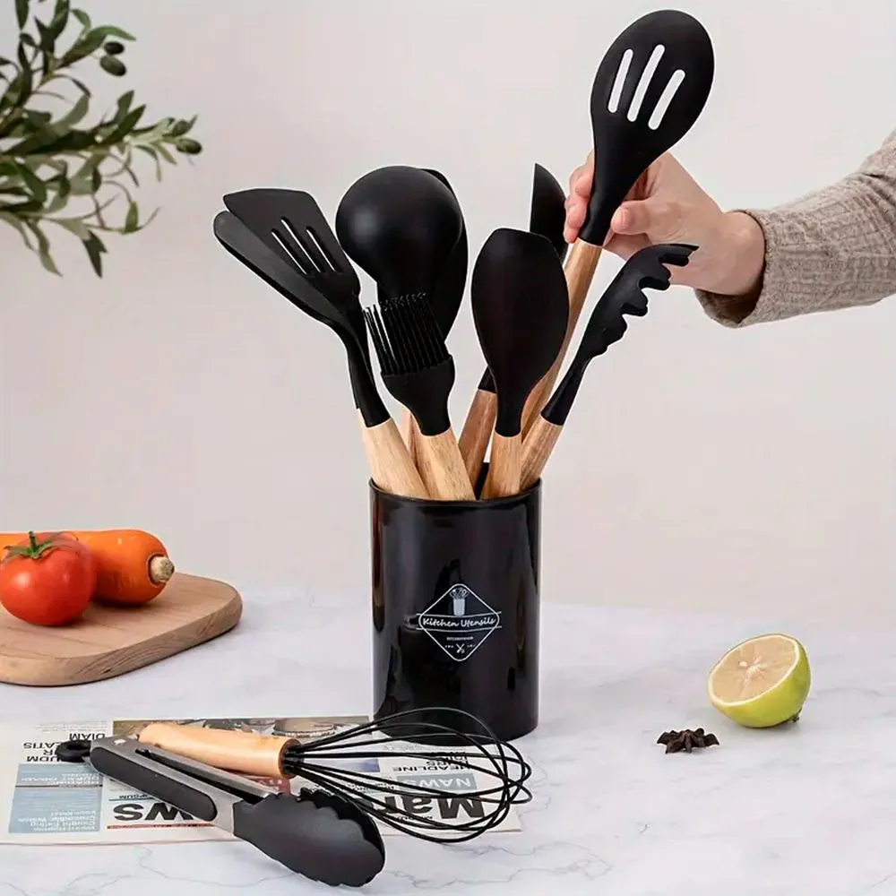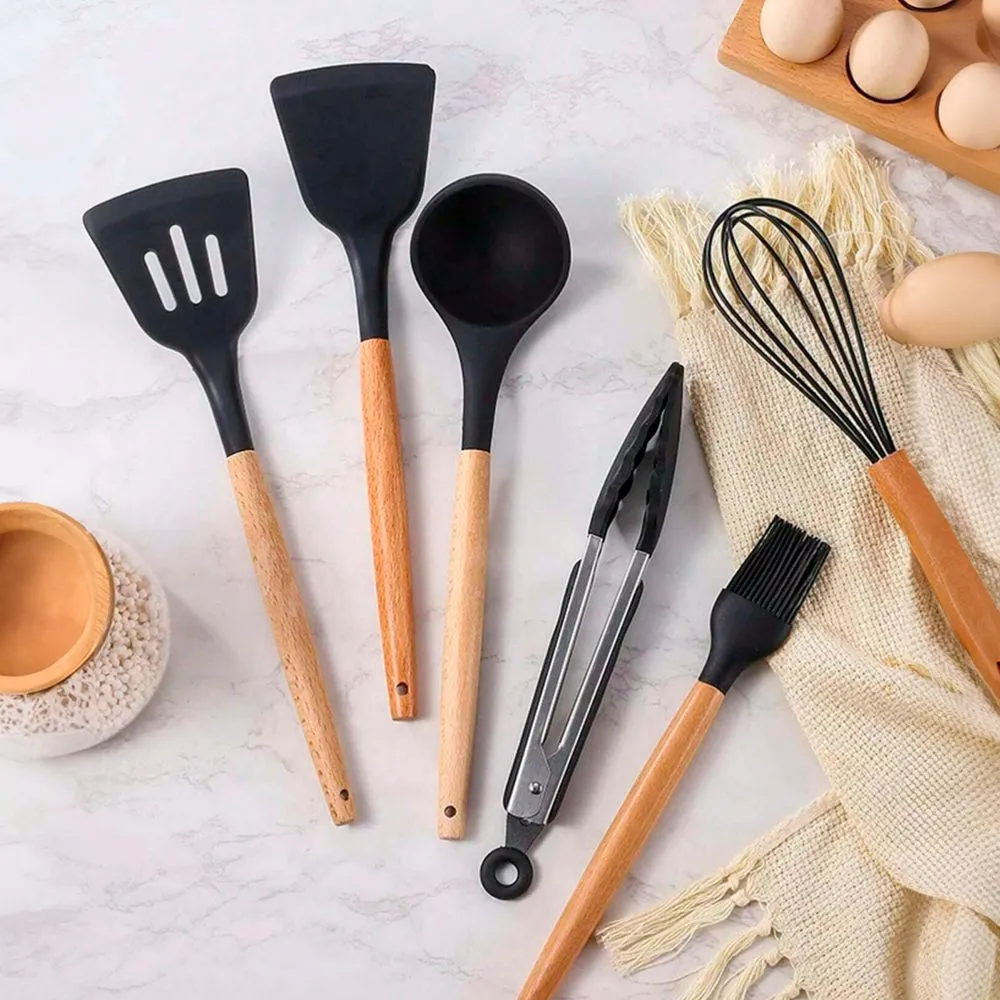 Juego de utensilios de cocina de silicona Negro, 12 piezas con mango de madera. Resistentes al calor, antiadherentes y seguros para todo tipo de ollas y sartenes. ¡Funcionalidad y estilo en tu cocina!