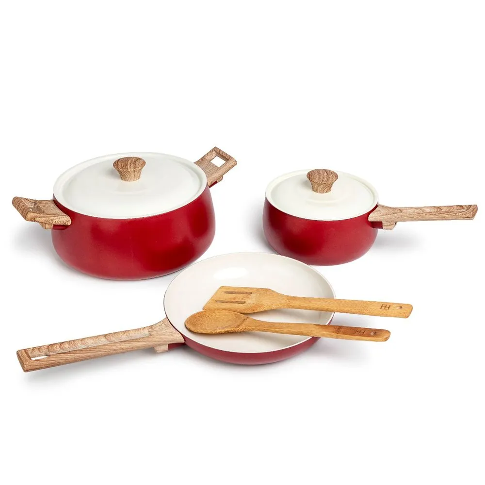 Este juego de ollas de 7 piezas en aluminio rojo con tapa blanca combina diseño moderno y funcionalidad. Ideal para el uso diario, ofrece una cocción eficiente y un toque decorativo en tu cocina.