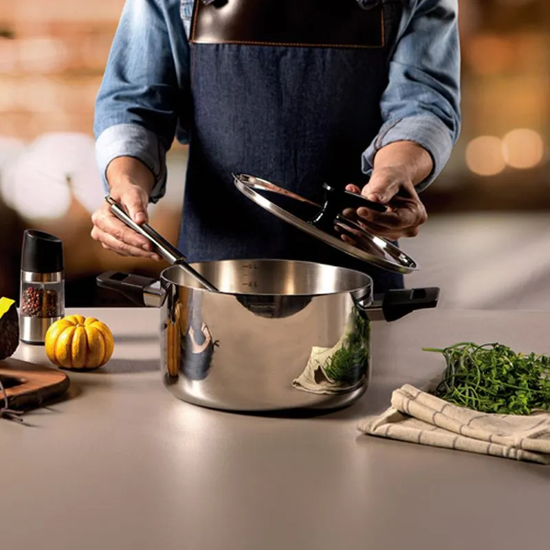 Apta para uso diario Tiene Cuerpo triple (acero inoxidable + aluminio + acero inoxidable). Mango Baquelita - Forma:Redonda