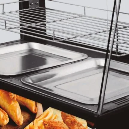 Vitrina mantenedora de productos calientes: Ideal para mantener tus alimentos a la temperatura perfecta, asegurando calidad y frescura. Interior fabricado en acero inoxidable: Resistente, duradero y fácil de limpiar, perfecto para uso comercial exigente. Laterales en vidrio: Para una visualización clara y atractiva de tus productos, mejorando la exhibición. Frente fabricado en vidrio curvo de alta resistencia: Diseño elegante y robusto, que proporciona una excelente durabilidad y visibilidad. Apertura posterior con sistema de puerta abatible: Facilita el acceso y reposición de productos con mayor comodidad y rapidez.